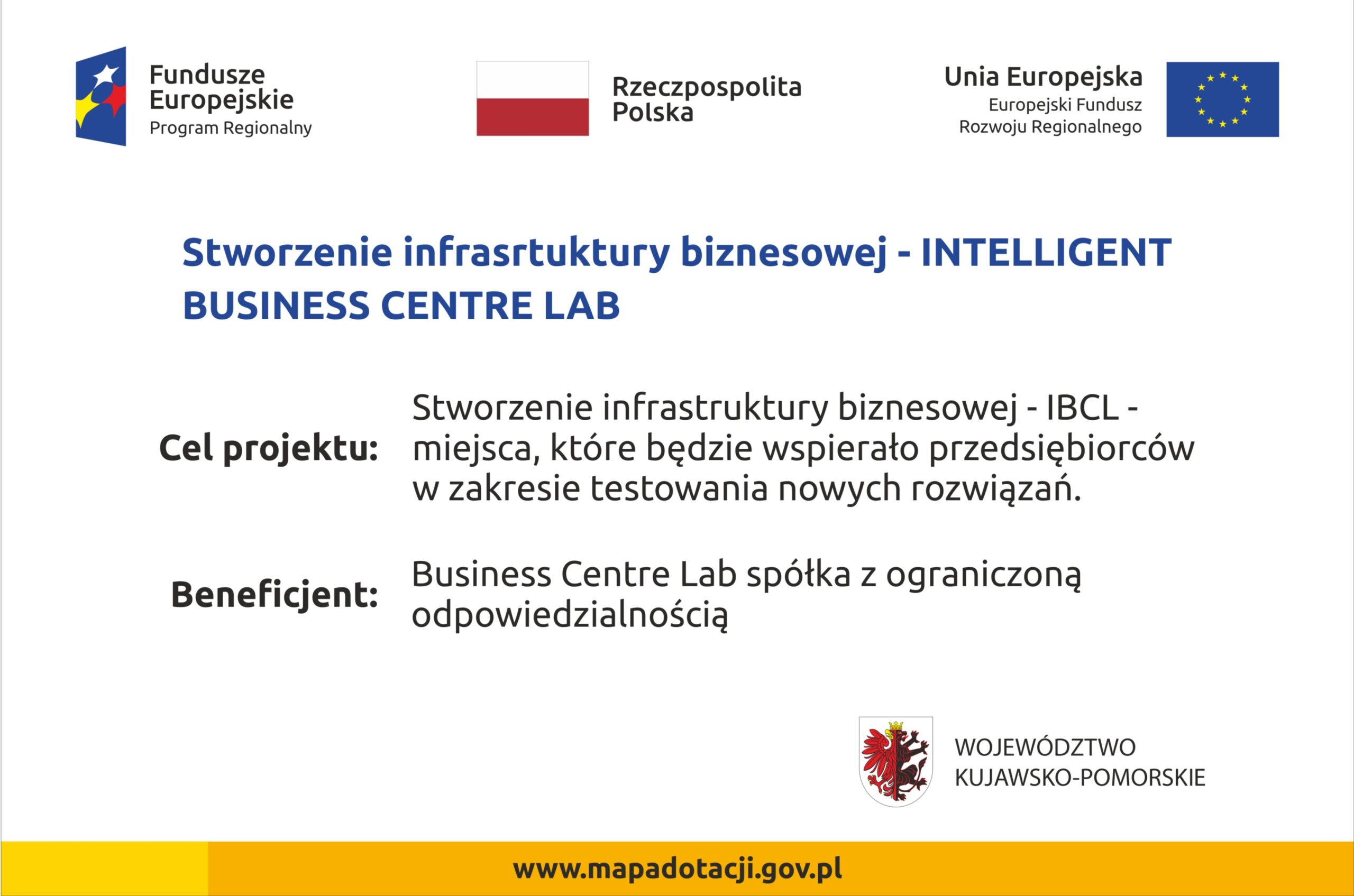 Informujemy, że Business Centre Lab Spółka z ograniczoną odpowiedzialnością otrzymała dofinansowanie na realizację projektu „Stworzenie infrastruktury biznesowej – INTELLIGENT BUSINESS CENTRE LAB” nr RPKP.01.04.03-04-006/20, ze środków Europejskiego Funduszu Rozwoju Regionalnego w ramach Osi priorytetowej 1 Wzmocnienie innowacyjności i konkurencyjności gospodarki regionu.